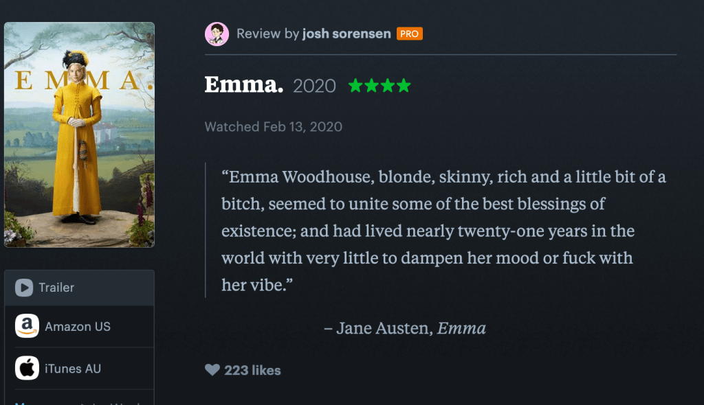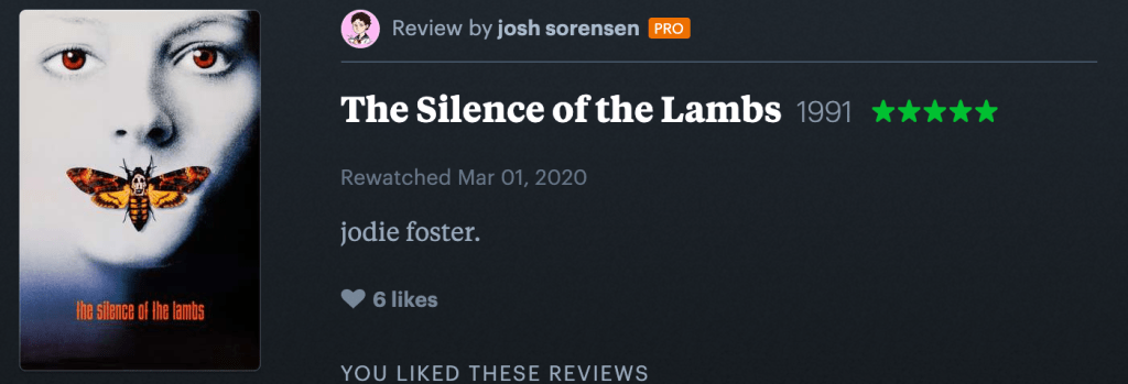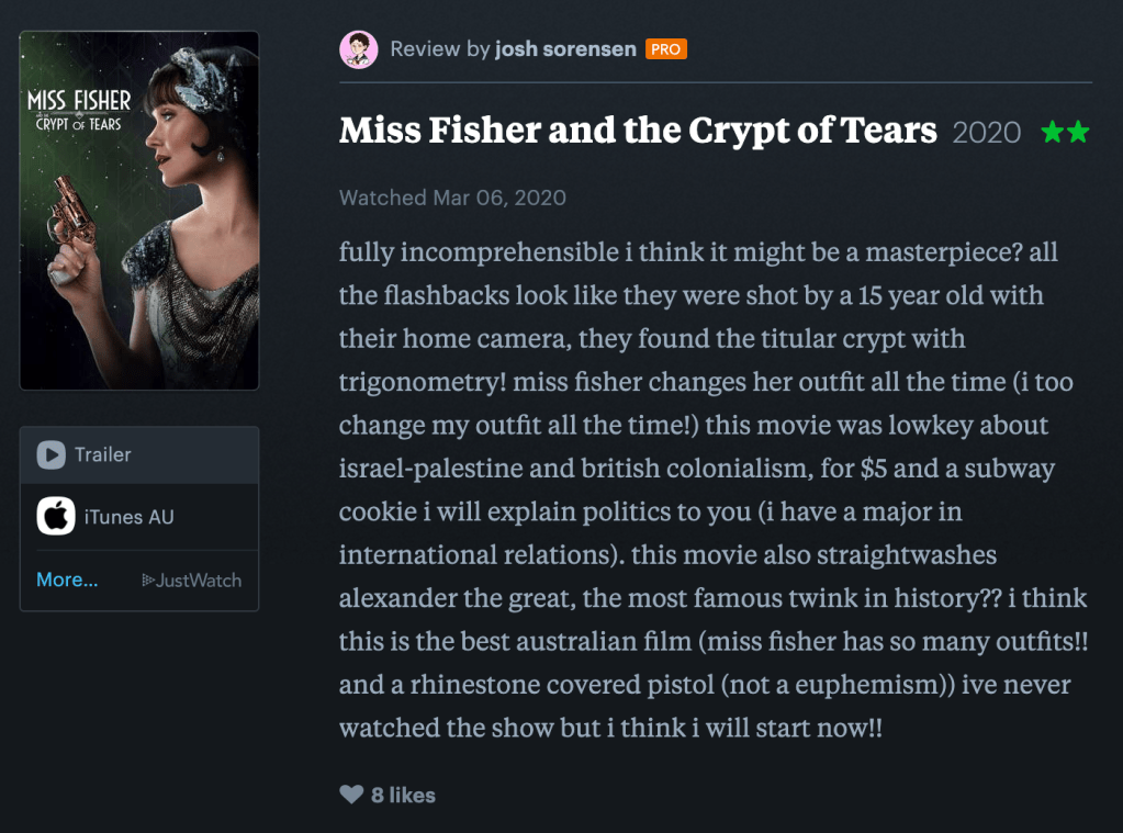 Film Daze is also pushing for more thoughtful analysis. We’re launching the Film Daze magazine this month which features essays exclusively, much in the vein of Bright Wall/Dark Room, but again with a focus on representation. While I can’t show evidence of the (modest) hand I’ve had in shaping it for privacy reasons I can show that it is happening and say that I have writing forthcoming in it, so more evidence and iterations soon to come (it’ll cost like $1 to subscribe, our first issue is on vampires!!! it’s so cool)
