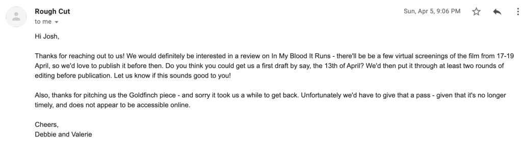 So far I’ve had criticism published at Cosmic, Screen Queens, Flip Screen, Chattr (lol), Memoir Mixtapes, and Rough Cut.