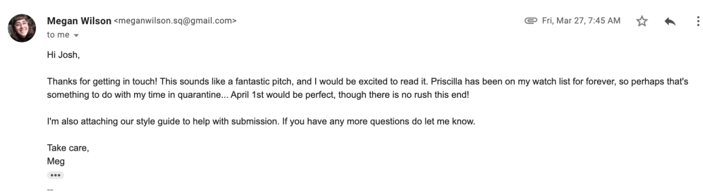 Feedback: Um, well I’ve gotten more pitch acceptances vs rejections, so that counts. And, uh, y’all have to give me feedback too, so I’m counting that, bless.