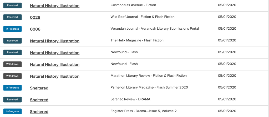 Why, to what purpose? Uh, I want to publish a novel one day, and these are the building blocks. Having your name out there in the world, among the literary journals, is the kind of stuff publishers want to see. That combined with my slowly building Brand™ I should hopefully be able to lob whatever terrible content I throw at them one day (assuming I ever finish writing my novel) and they’ll be like “it’ll sell I guess”.